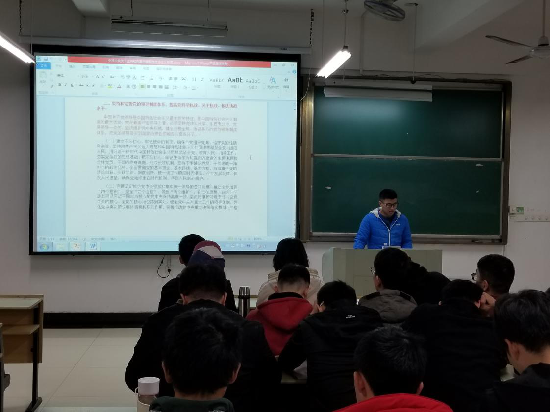 11月28日,机械工程学院本科生第一党支部在机械楼407教室召开党员大会,专题学习《中共中央关于坚持和完善中国特色社会主义制度 推进国家治理体系和治理能力现代化若干重大问题的决定》。会议由支部书记章军主持,全体学生党员参加会议。