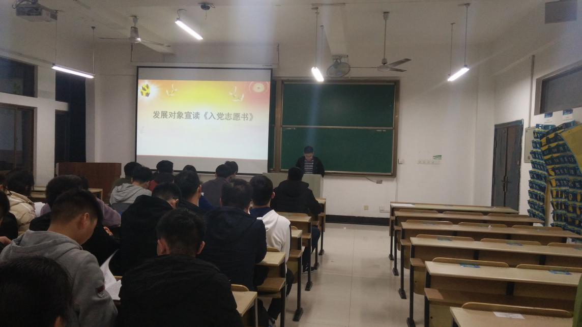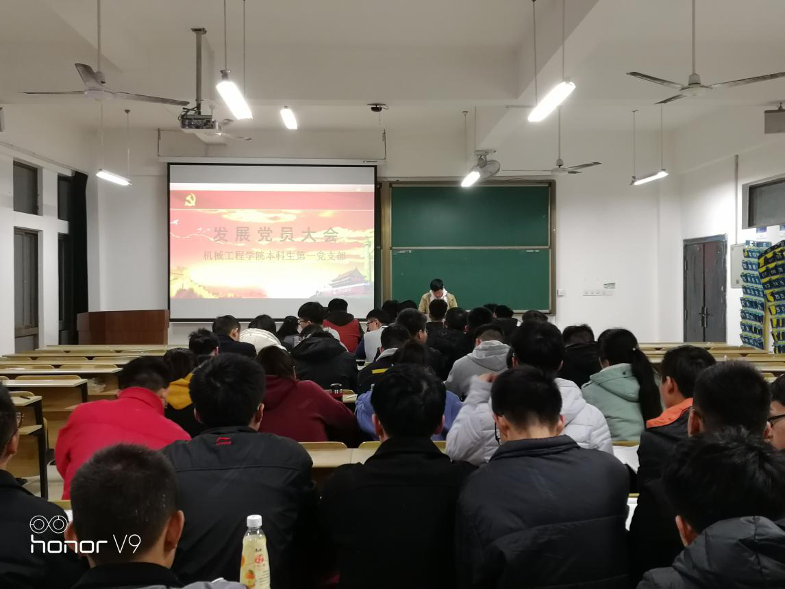 2018年11月26日机械工程学院本科生第一党支部在机械楼407教室召开了入党积极分子发展为中共预备党员大会,该会议由本科生第一党支部书记章军同志主持召开,本科生第一党支部的正式党员及预备党员参加了此次会议。