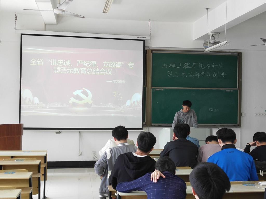 11月2日,机械工程学院学生第三党支部在机械楼405召开学习例会,学习“全省讲忠诚、严纪律、立政德,专题警示教育总结会议”。会议由支部书记王琴主持,支部全体党员参加了此次会议。