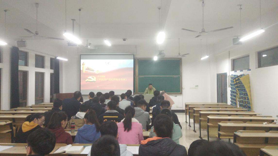 2018年10月27日晚上,机械工程学院本科生第一党支部党支部于机械楼405教室集中学习了新修订的《中国共产党纪律处分条例》(以下简称《条例》),会议由党支部书记章军主持。