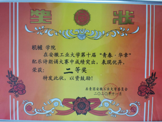 在刚结束不久的安徽工业大学第十届“青春·华章”配乐诗朗诵大赛中,机械工程学院参赛队伍获得了二等奖的好成绩。