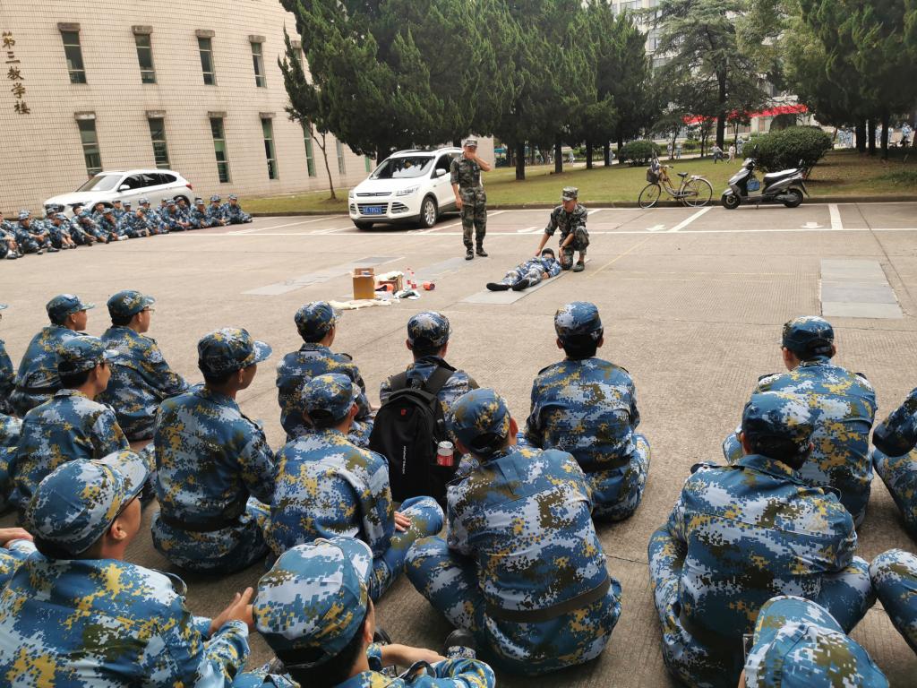 9月23日下午,机械工程学院2020级新生在佳山校区第三教学楼开展了卫生健康教育和战场医疗救护训练,此次教学活动由校医院工作人员和军训教官担任主讲。