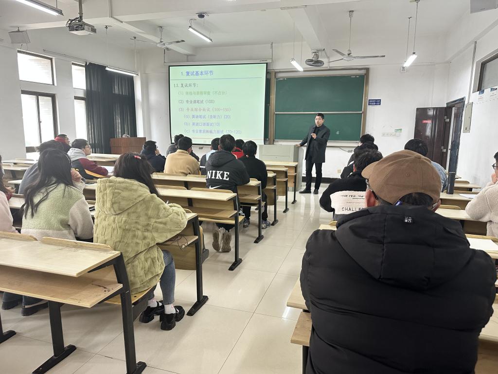 会上,饶思贤首先结合实际对考研学生的意志力表示肯定,向大家指出了考研复试的重要性,强调不论是第一志愿院校还是调剂院校的复试都不能掉以轻心。然后结合本学院研究生招生复试办法介绍了复试的要求与形式,介绍了本院的专硕与学硕达线情况,围绕备考流程、英语备考、注意事项等方面进行了详细的讲解。他强调,大家要对自己的初试成绩进行综合考虑,积极为选择第一志愿院校复试还是调剂到其他院校做好预判,努力提高复试成功率。