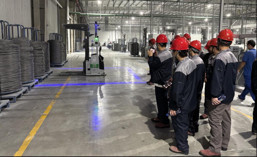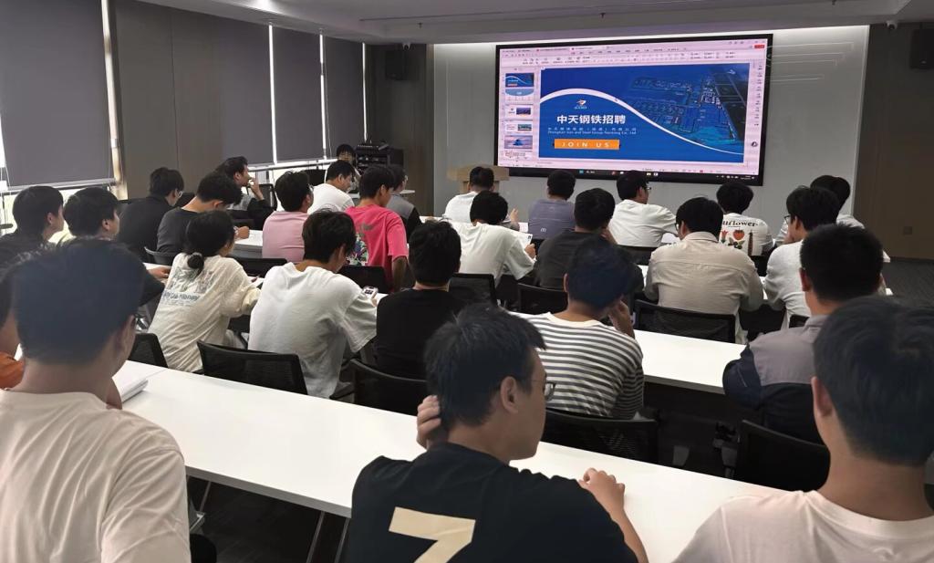 在淮安基地,中天钢铁培训人员为学生详细讲解了钢帘线产品知识以及湿拉、干拉等工艺流程,并组织同学们参观AGV小车、工业机器人、自动化仓储系统等智能制造设备。通过现场观摩与MES系统联动演示,学生们直观感受到智能制造如何助力提质增效,也进一步理解了智能化在传统冶金行业中的应用前景。