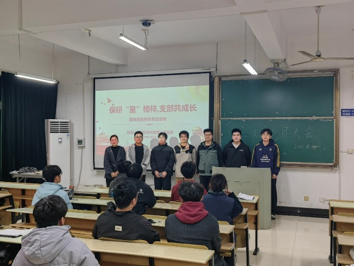 为发挥党支部战斗堡垒与党员先锋模范作用,2025年11月18日,机械工程学院本科生第二党支部在机械楼 405 开展 “保研‘星’榜样,支部共成长” 推免经验传承主题党日活动。活动邀请保研至中南大学的周俊辰、保研至天津大学的朱振国两位优秀党员分享,党支部书记童辉辉主持,支部全体党员参与。
