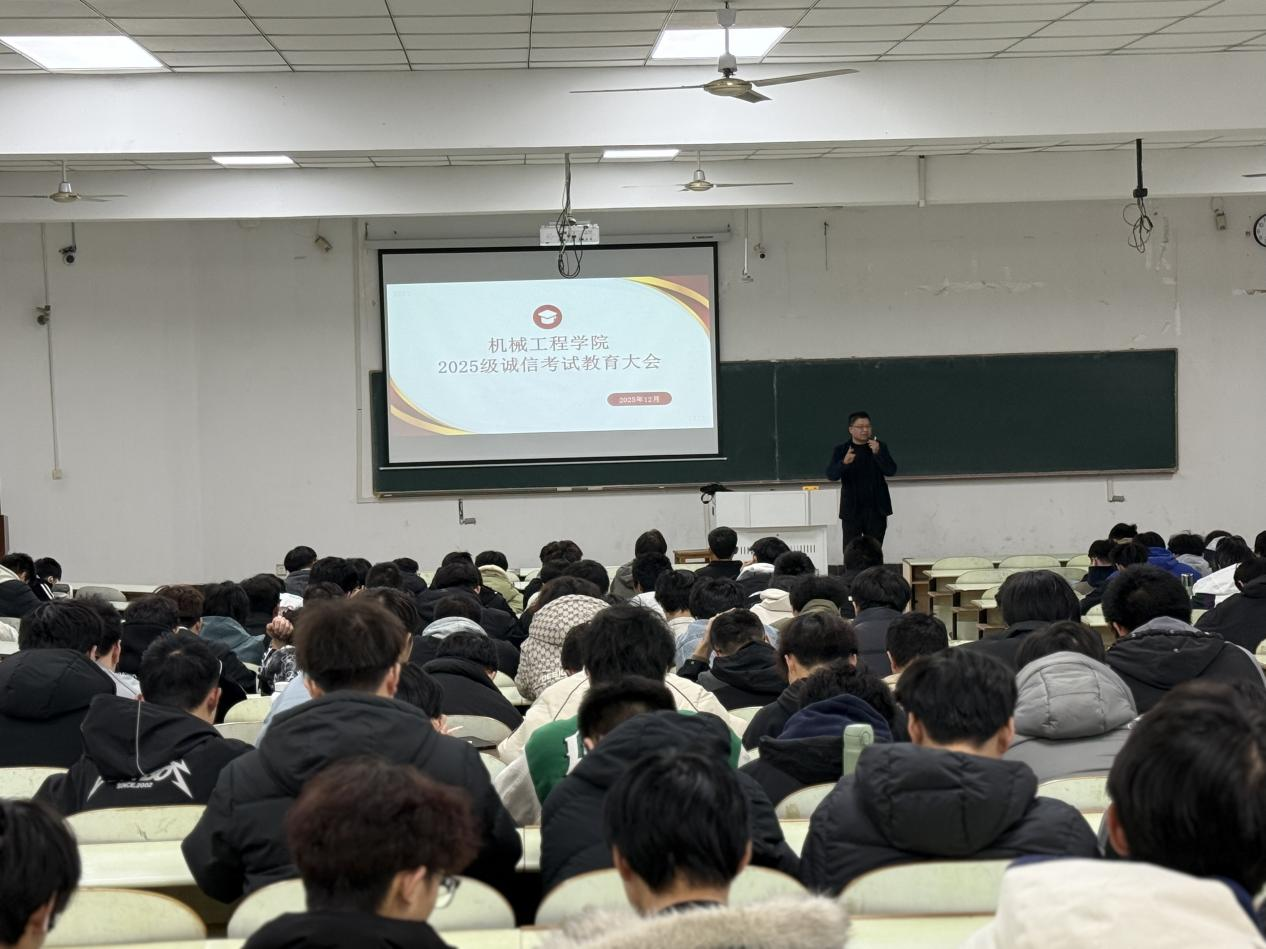 为进一步加强考风考纪建设,引导学生树立诚信应考意识,营造公平公正的考试氛围,12月22日晚,机械工程学院召开2025级诚信考试教育大会,此次大会由辅导员董春辉、毕苗主持,2025级全体学生参会。