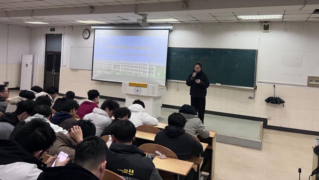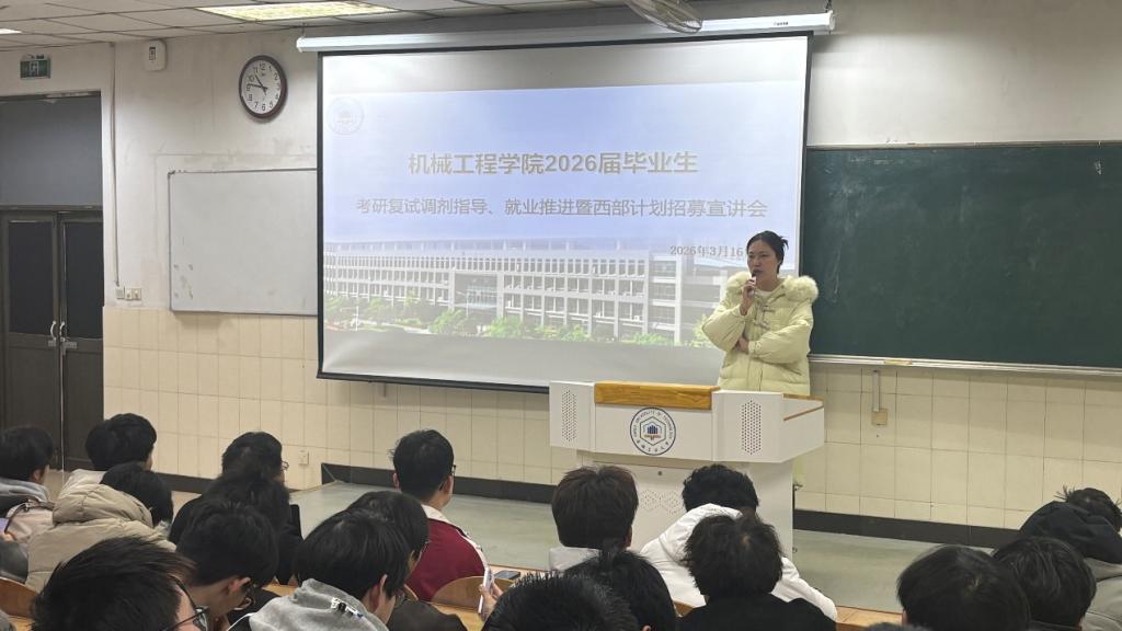 2026年3月16日,为切实做好2026届毕业生升学与就业服务工作,扎实推进西部计划及研究生支教团招募宣传,机械工程学院在东教一阶101教室召开专题宣讲会。会议由毕业班辅导员濮莹萍、孙紫玮共同主持,学院2026届全体毕业生参会。