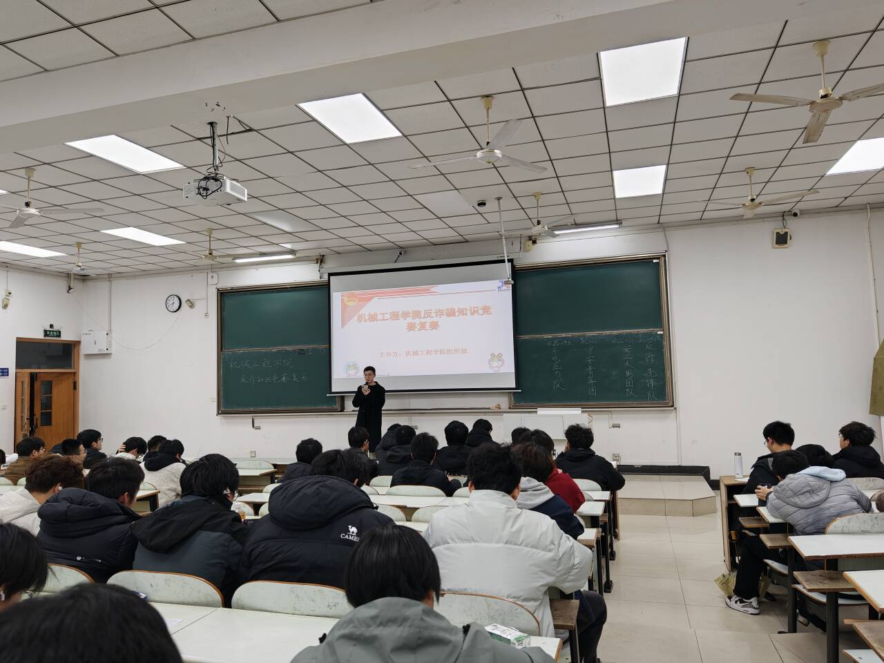 晋级复赛代表队同台竞技、各展风采。复赛设置必答题、抢答题两大环节,必答题环节中,各队伍沉着冷静、从容作答,展现出扎实的反诈知识功底;抢答题环节里,选手们反应迅速、争先抢答,现场氛围紧张热烈,充分彰显了良好的团队协作能力与临场应变能力。竞答环节结束后,全场共同观看反诈宣传视频,通过真实案例强化警示教育,让反诈理念更加深入人心。本次大赛最终评选出 10 名 “反诈小卫士”,并推选机工 253 团支部代表学院参加校级决赛。